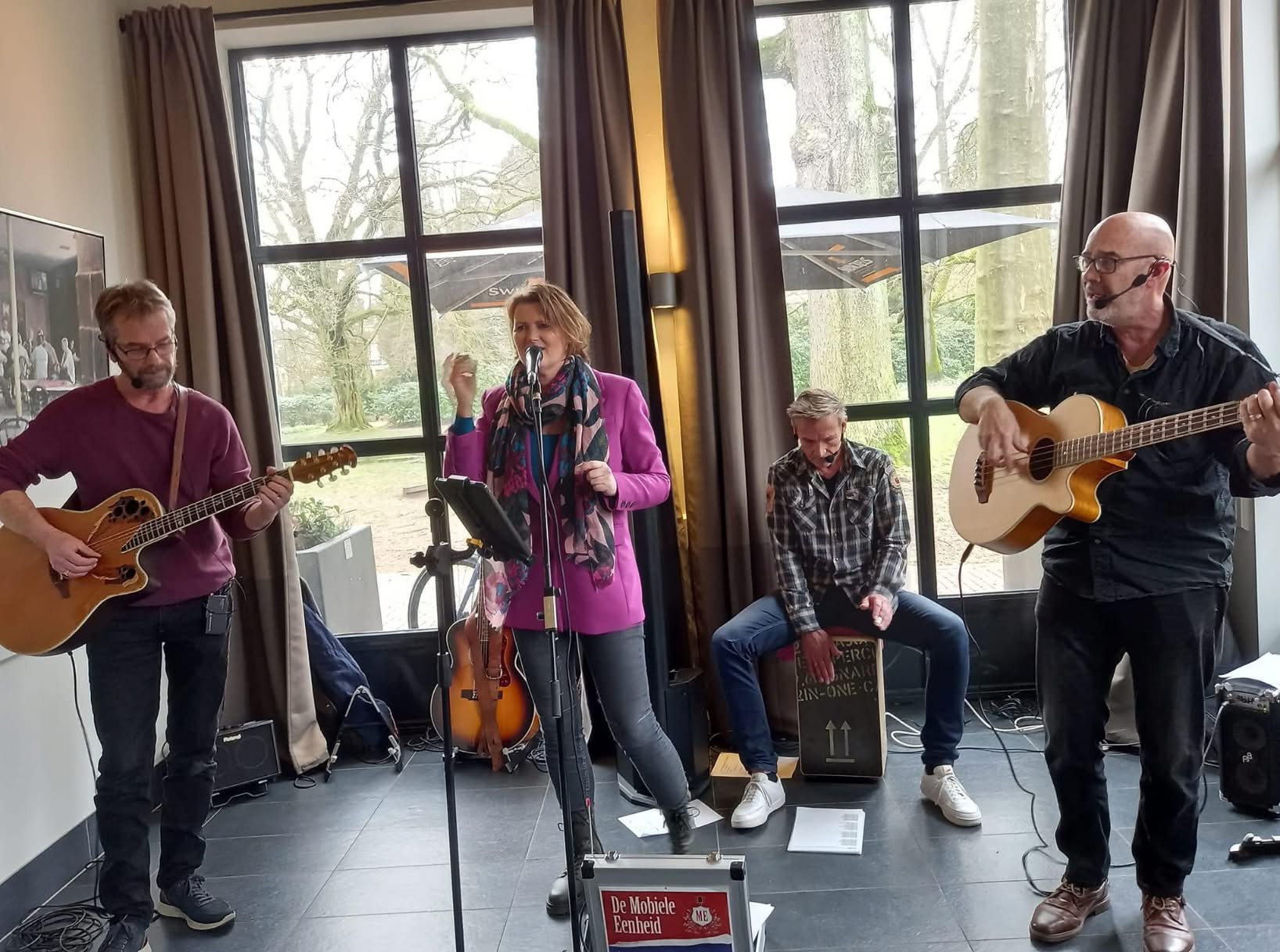 Live muziek is toch het mooiste wat er is. Maar je hebt niet altijd de tijd of ruimte voor een complete band met versterking, licht en podium. Soms heb je ook geen zin in een hele avond ‘herrie’. Laat daarom De Mobiele Eenheid uitrukken! Een semi-akoestische coverband die past bij elke gelegenheid, binnen een half uur opbouwt en een heel breed en aansprekend repertoire heeft. Binnen/buiten, overdag of 's avonds; alles kan.